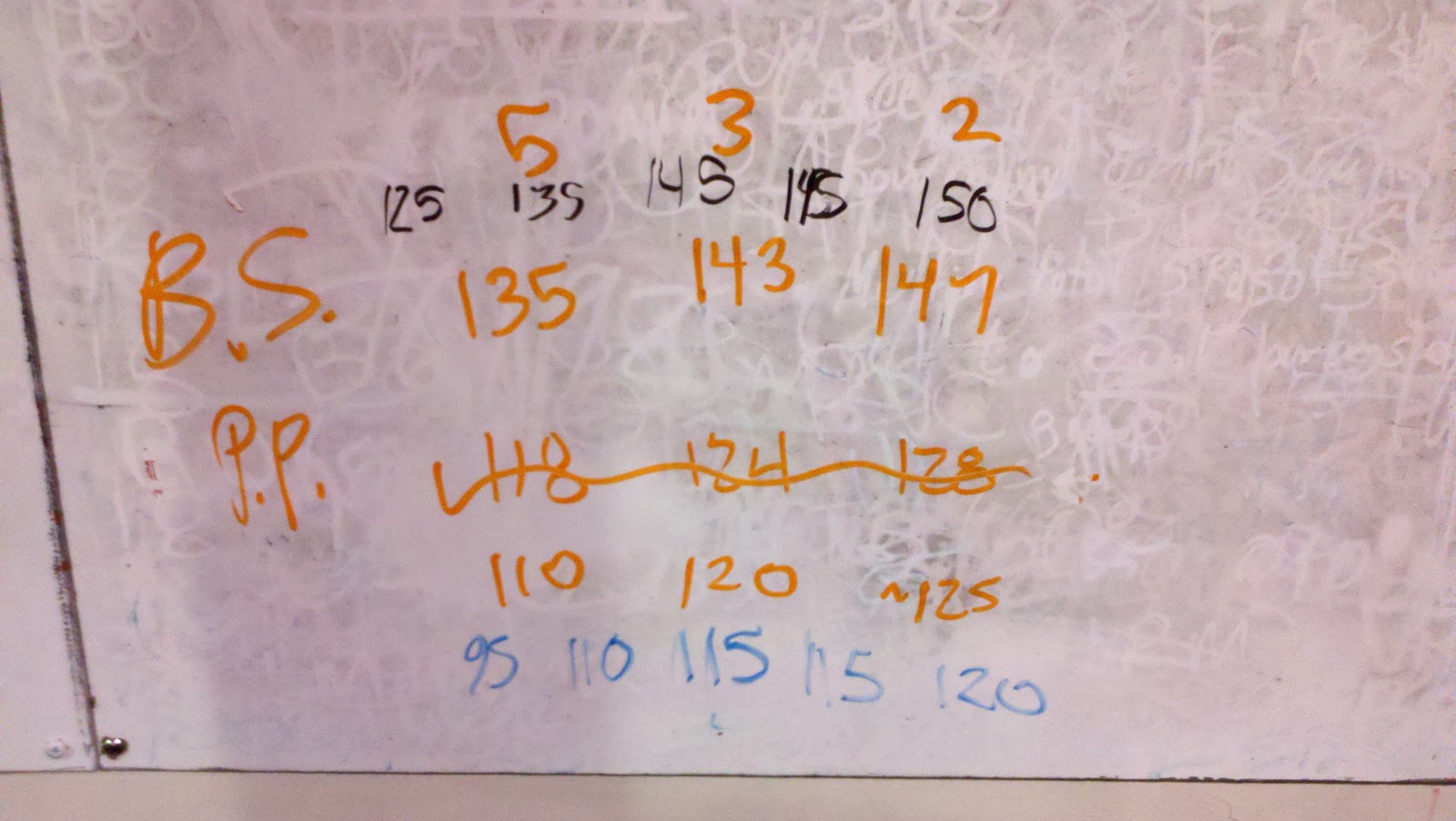 Note -- on Day 1 I didn't account for the bar only weighing 33 pounds. I'll keep track of that from now on. Would be nice to just lift in kilos, but pounds are all I have access to right now. Can only make 5 pound jumps as well -- I'm considering buying my own fractional plates.